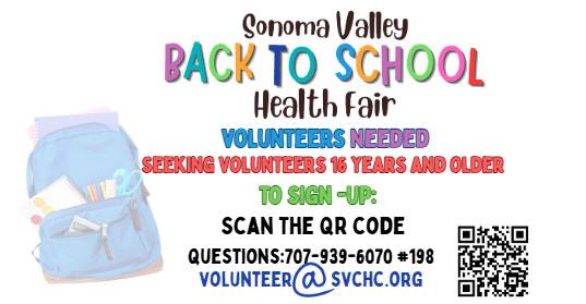 We’re incredibly grateful for the dedicated volunteers who help bring the Back to School Health Fair 2025 to life each year. All volunteers should now have their final confirmation email with day-of-event instructions. If you have questions, please reach out to 707-939-6070 ext. 198 or email volunteer@svchc.org