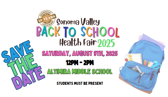 Join us in celebrating a decade of the 10th Annual Sonoma Valley Back to School Health Fair on Saturday, August 9th from 12–2 PM at Altimira Middle School! Hosted by SVCHC and the BTS Committee, this event brings together health services, interactive activities, and informational booths to help students and families kick off the school year healthy and prepared.