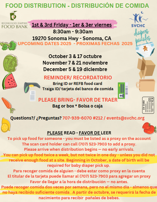 For more information, please call 707-939-6070, email events@svchc.org, or visit SVCHC Events Page. For other food distribution sites, please visit Redwood Empire Food Bank.