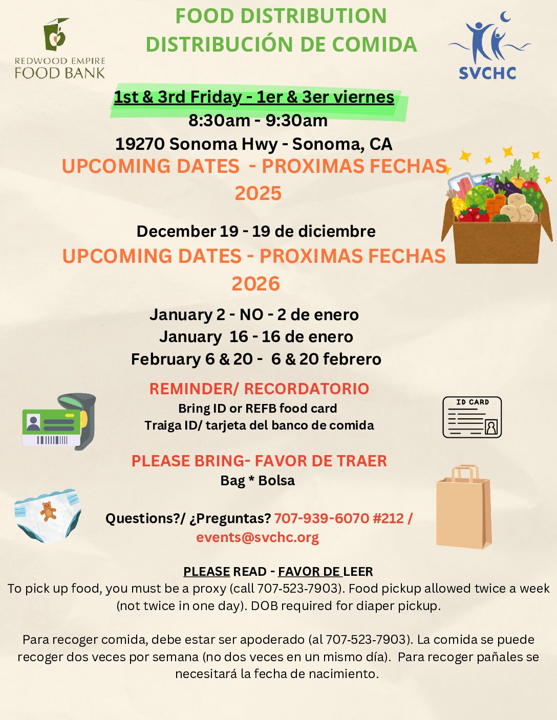 For more information, please call 707-939-6070, email events@svchc.org, or visit SVCHC Events Page. For other food distributions: